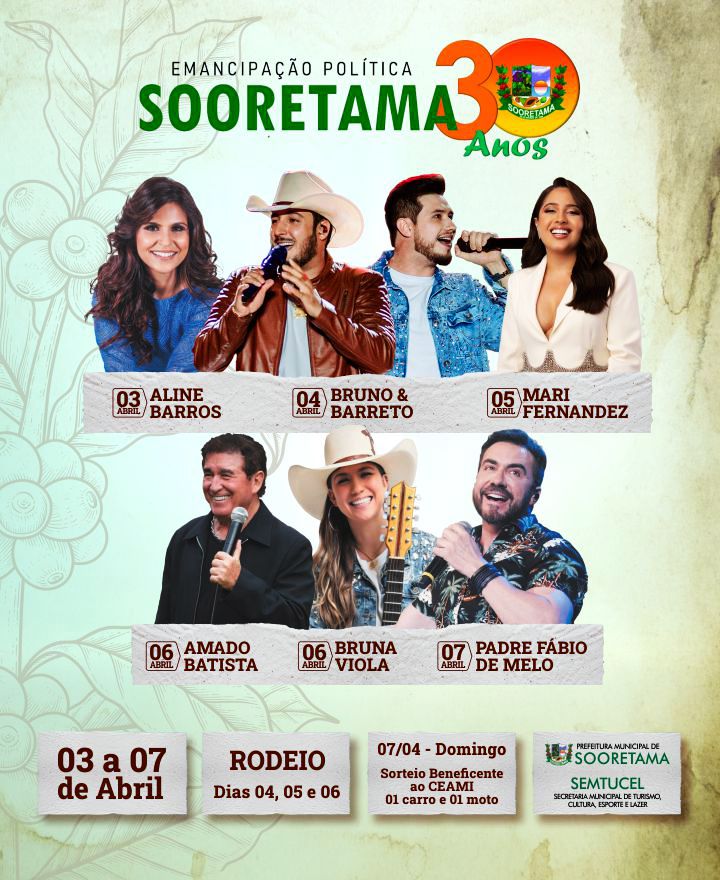 A festa em comemoração aos 30 anos de emancipação de Sooretama será realizada de 3 a 7 de abril. A principal atração é o cantor Amado Batista, que se apresenta no sábado (6) e deve lotar a área de eventos do município.