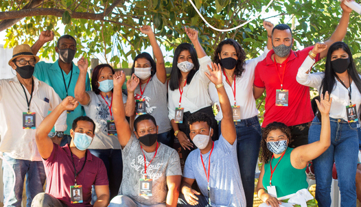 Fazem parte da equipe os mobilizadores: Carlos, Angélica, Luiz Carlos, Marijane, Monielle, Ocimar, Paulo e Washington. À frente estão: o coordenador de Mobilização José Costa, a coordenadora de Relacionamento com a Comunidade Luciana, o antropólogo Weleda e o assessor Técnico Administrativo Felipe.