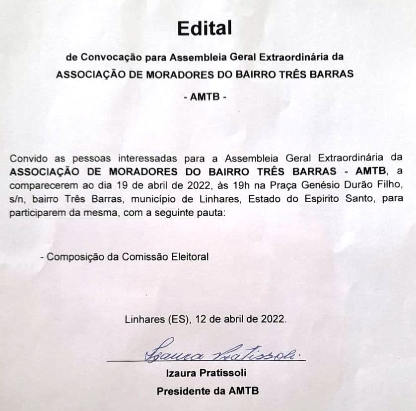 A Associação de Moradores do Bairro Três Barras realiza assembleia geral extraordinária para compor a comissão eleitoral visando às eleições na entidade. A reunião vai ocorrer no dia 19, às 19 horas, na praça Genésio Durão Filho. O edital é assinado pela presidente da associação, Izaura Pratissoli.