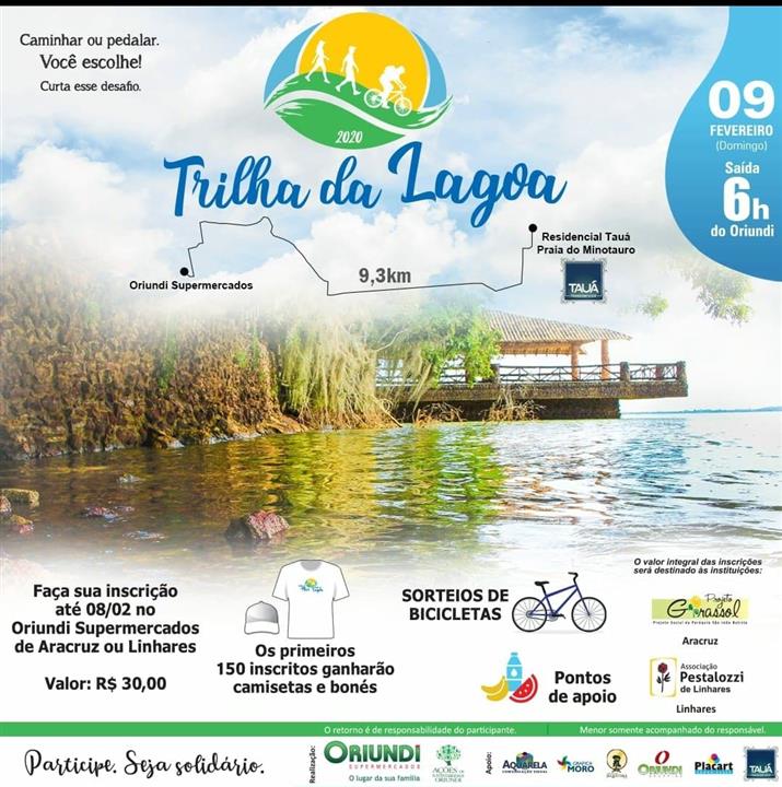 Linhares terá no dia 9 de fevereiro a Trilha da Lagoa. O trajeto de 9,3 quilômetros poderá ser feito a pé ou de bicicleta, com saída do Oriundi Supermercado, no bairro Três Barras, às 6 horas, e chegada no Tauá Residencial, Praia do Minotauro, no bairro Canivete.