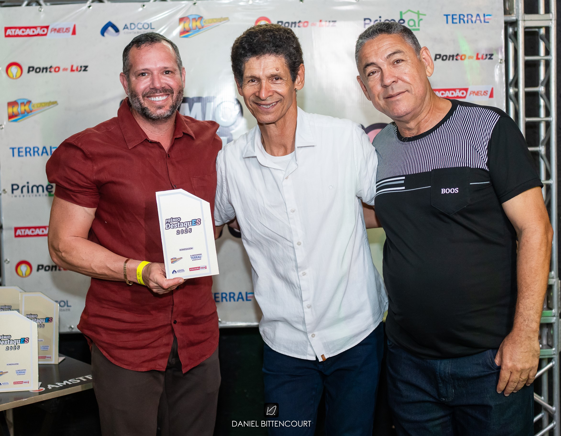Márcio Cuzzuol, CEO da Adcol Contabilidade, recebendo a homenagem das mãos do músico Dalcenir e do jornalista Daniel Porto