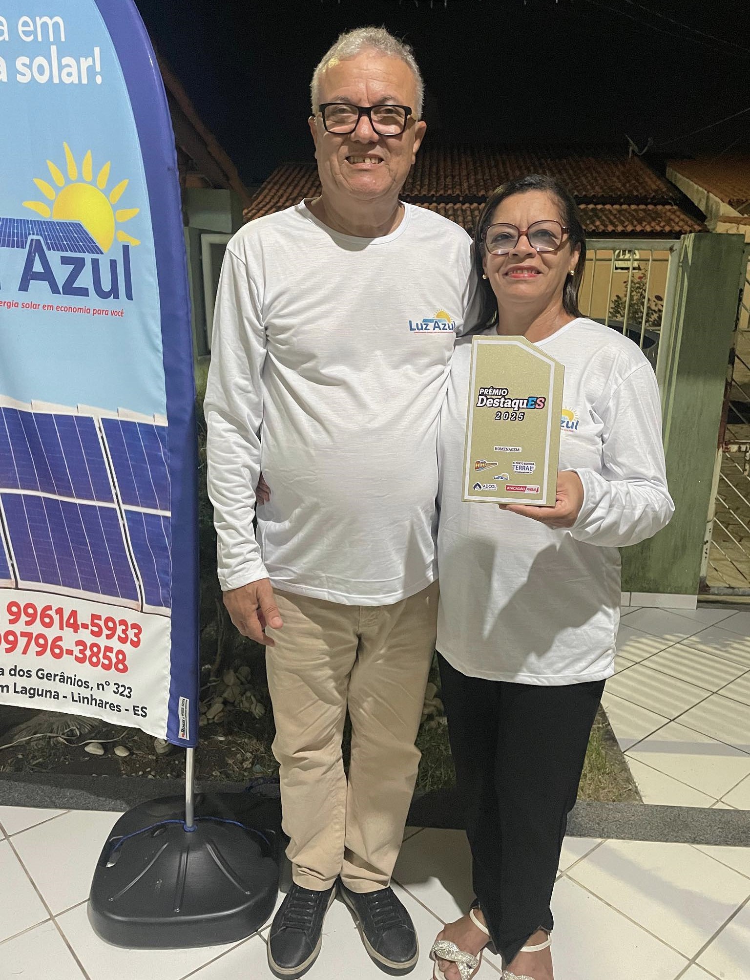 Representantes da Luz Azul Solar Energia Renovável comemoram a conquista do prêmio Destaque 2025, em Linhares. Para o proprietário, Francisco Emmanuel, o reconhecimento dos clientes e da população ao trabalho realizado é gratificante.